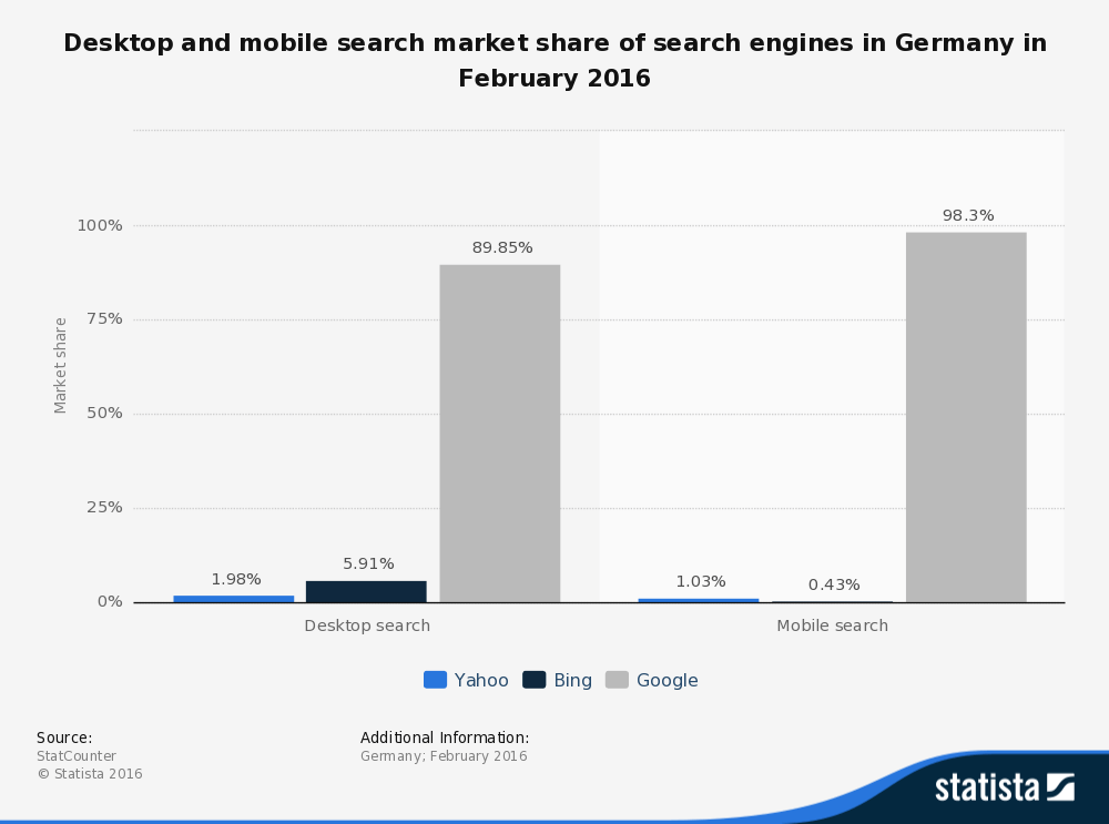 Laut Statista beträgt der Bing-Marktanteil für Suchmaschinen in Deutschland 5,91%. Grob gesagt kann man durch das Fahren einer Bing Ads Kampagne also knapp 6% der Suchmaschinen-Nutzer in Deutschland erreichen. Dies mag wenig erscheinen, jedoch ist im Vergleich zu den vergangenen Jahren eine beachtliche Steigung zu erkennen. Warum also auf das Ausschöpfen des sämtlichen Marktes verzichten?
